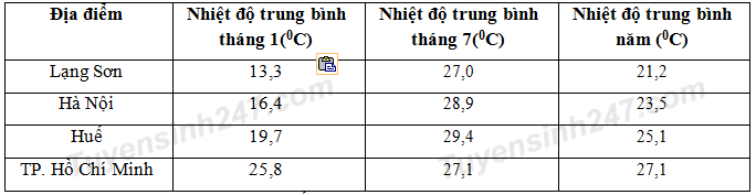 Cho bảng số liệu: Nhiệt độ một số địa điểm nước ta (oC) Nhận xét nào sau đây không