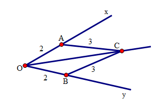 Cho \(\widehat {xOy} = {50^0}\), vẽ cung tròn tâm O bán kính bằng 2cm, cung tròn này cắt Ox, Oy lần lượt ở A và B. Vẽ các cung tròn tâm A và tâm B có bán kính 3cm, chúng cắt nhau tại điểm C nằm trong góc xOy. Tính \(\widehat {xOC}\)
