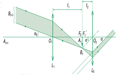 + Khoảng cách giữa hai kính: \(L = {f_1} + {f_2}\)