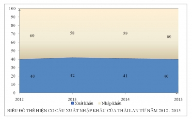 Cho biểu đồ về cơ cấu xuất nhập khẩu của Thái Lan qua các năm (Nguồn: Niên giám thống kê