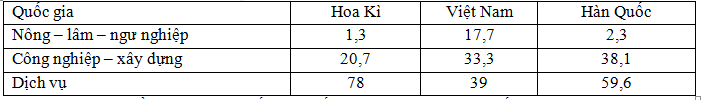 Cho bảng số liệu: Tỷ trọng 3 khu vực kinh tế trong tổng sản phẩm trong