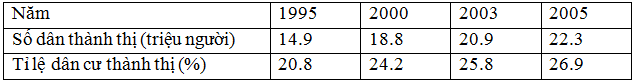 Cho bảng số liệu: Số dân thành thị và tỉ lệ dân cư thành thị ở nước ta giai đoạn 1995 -