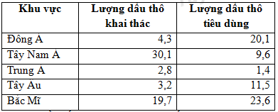 Cho bảng số liệu sau: LƯỢNG DẦU THÔ KHAI THÁC VÀ TIÊU DÙNG Ở MỘT SỐ KHU VỰC TRÊN THẾ GIỚI