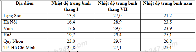 Cho bảng số liệu sau: NHIỆT ĐỘ TRUNG BÌNH TẠI MỘT SỐ ĐỊA ĐIỂM (đơn vị: 0C) (Nguồn số