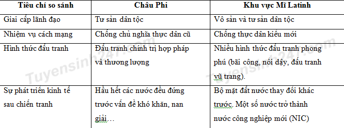 + Giống nhau: Phong trào giải phóng dân tộc đều phát triển mạnh mẽ sau Chiến tranh thế giới thứ hai (1945), châu Phi “Lục địa mới mới trỗi dậy”, còn Mĩ Latinh “Đại lục núi lửa”, " Lục địa bùng cháy" .Hầu hết đều giành được độc lập.