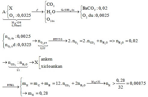 3. Hỗn hợp khí A gồm hiđrocacbon X và 728 ml O2 đựng trong bình kín. Đun nóng A cho đến khi phản ứng kết thúc, dẫn các sản phẩm sau phản ứng qua bình đựng dung dịch Ca(OH)2 lấy dư. Sau thí nghiệm, thu được 2 gam kết tủa và cuối cùng còn 56 ml một chất khí duy nhất thoát ra. Xác định công thức phân tử của hiđrocacbon X. Biết MX < 32, các phản ứng xảy ra hoàn toàn và thể tích các khí đều đo ở đktc.