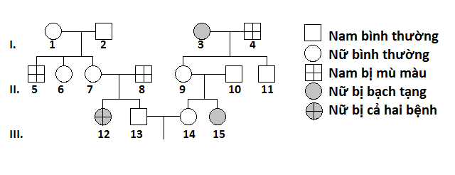 Sơ đồ phả hệ dưới đây mô tả hai bệnh di truyền ở người, bệnh bạch tạng do một gen có 2 alen năm tren NST thường quy định, bệnh mù màu do một gen có 2 alen nằm trên NST X tại vùng không tương đồng trên Y quy định.