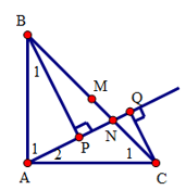 b) Gọi M là trung điểm của BC. Lấy N là một điểm trên đoạn thẳng MC. Kẻ BP và CQ vuông góc với tia AN. Chứng minh PQ = BP – CQ.