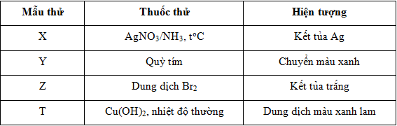 Kết quả thí nghiệm của các dung dịch X,Y,Z, T với thuốc thử được ghi trong bảng sau: