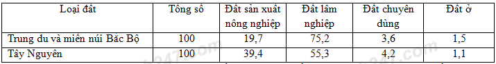 Cho bảng số liệu CƠ CẤU SỬ DỤNG ĐẤT Ở TRUNG DU MIỀN NÚI BẮC BỘ VÀ TÂY NGUYÊN NĂM