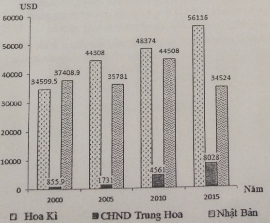 Cho biết nhận xét nào sau đây đúng về tổng sản phẩm trong nước bình quân đầu người theo giá hiện hành của một số nước trong giai đoạn 2000-2015?