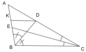 Cho \(\vartriangle \)ABC (AB < AC) các phân giác BD, CE. Đường thẳng qua D và song song với BC cắt AB ở K, chứng minh E nằm giữa B và K.