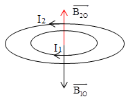 Hai khung dây kim loại hình tròn, đồng phẳng, đồng tâm O có bán kính lần lượt là R1 = 3 cm và R2 = 6 cm. Dòng điện chạy trong khung dây nhỏ là I1 = 1 A cùng chiều kim đồng hồ. Để cảm ứng từ tại O bằng 0 thì cường độ và chiều dòng điện chạy trong khung dây lớn là