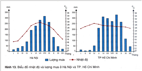 Dựa vào biểu đồ NHIỆT ĐỘ VÀ LƯỢNG MƯA CỦA HÀ NỘI VÀ THÀNH PHỐ HỒ CHÍ MINH Nhận xét