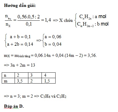 Cho 2,24 lít hỗn hợp X (đktc) gồm 2 hiđrocacbon mạch hở lội từ từ qua bình chứa 560ml dung dịch Br2 0,5M. Sau khi phản ứng xảy ra hoàn toàn, lượng Br2 giảm đi một nửa và khối lượng bình tăng thêm 3,56 gam. Hai hiđrocacbon đó là