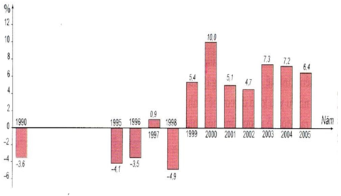 Cho biểu đồ sau: Tốc độ tăng trưởng GDP của LB Nga giai đoạn 1990 – 2005. Nhận xét nào sau