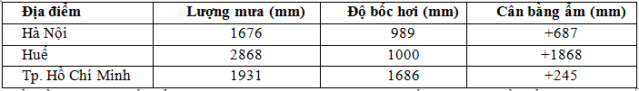 Lượng mưa, lượng bốc hơi và cân bằng ẩm của các địa điểm