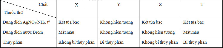 Bảng dưới đây ghi lại hiện tượng khi làm thí nghiệm với các chất X, Y, Z, T ở dạng dung dịch: