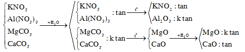 Chỉ được dùng thêm nước và các thiết bị cần thiết (lò nung, đèn cồn…). Hãy trình bày cách phân biệt 4 chất bột màu trắng (tương tự nhau) đựng riêng biệt trong 4 lọ mất nhãn: KNO3, Al(NO3)3, MgCO3, CaCO3. Viết phương trình hóa học của các phản ứng xảy ra (ghi rõ điều kiện nếu có).