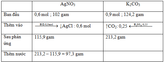 Đặt 2 cốc A, B có cùng khối lượng lên 2 đĩa cân thăng bằng. Cho vào cốc A 102 gam chất rắn AgNO3; cốc B 124,2 gam chất rắn K2CO3.