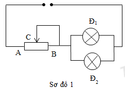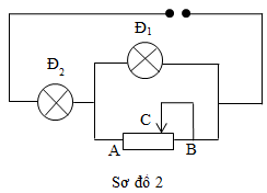 2) Có hai đèn Đ1 (6V – 3W) và Đ2 (6V - 6W); một nguồn điện có hiệu điện thế 12 V. Một biết trở con chạy loại có 3 chốt cắm dây và có điện trở toàn phần là 20 Ω, với hình dạng như hình.