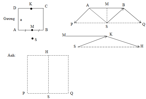 1) Cho một gương phẳng hình vuông cạnh 10cm đặt thẳng đứng trên sàn nhà, mặt phản xạ của gương hướng vào tường và song song với tường và cách tường một khoảng. Trên sàn, sát chân tường, trước gương, trên trung trực của cạnh dưới của gương có một nguồn sáng điểm S.