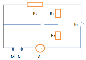 Cho mạch điện như hình vẽ, R2 - 3Ω. Khi 2 khóa đều ngắt ampe kế chỉ 0,5 A. Khi K1 đóng, K2 ngắt ampe kế chỉ 2 A. Khi K2 đóng, K1 ngắt ampe kế chỉ 1 A.
