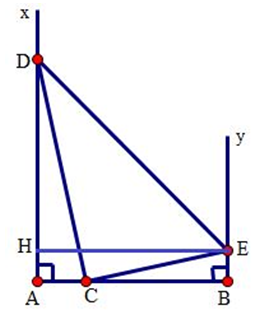 Cho đoạn thẳng AB = 7cm. Lấy điểm C thuộc AB sao cho AC = 2cm. Trên cùng một nửa mặt phẳng bờ AB vẽ hai tia Ay và Bx cùng vuông góc với AB. Lấy điểm D thuộc Ax, điểm E thuộc tia By sao cho AD = 10cm, BE = 1cm.