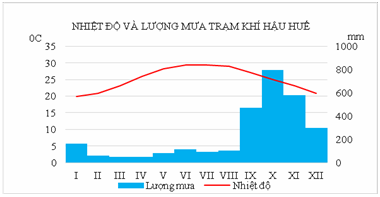 Dựa vào biểu đồ đã cho, dễ nhận xét thấy Huế có tổng lượng mưa lớn do nằm ở sườn đón gió qua biển, mùa mưa lệch dần về thu đông do ảnh hưởng của bão, dải hội tụ nhiệt đới và gió mùa mùa đông qua biển.