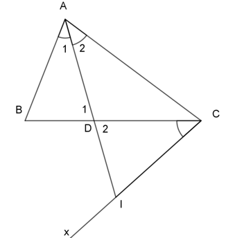 Câu 3 (Vận dụng): Cho \(\Delta ABC\) (AB < AC), có AD là đường phân giác trong. Ở miền ngoài \(\Delta ABC\) vẽ tia Cx sao cho \(\widehat{BCx}=\widehat{BAD}\). Gọi I là giao điểm của Cx và AD. Chứng minh rằng: