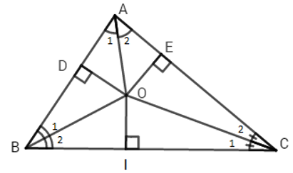 Cho \(\Delta ABC\) vuông tại A, \(AB=8cm,AC=15cm\). Gọi O là giao điểm của ba đường phân giác trong \(\Delta ABC\). Từ O kẻ OD, OE, OI lần lượt vuông góc với AB, AC và BC.