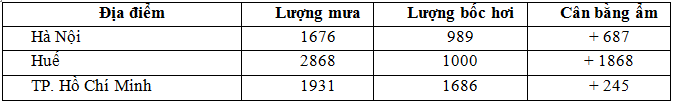 Cho bảng số liệu: LƯỢNG MƯA, LƯỢNG BỐC HƠI VÀ CÂN BẰNG ẨM CỦA MỘT SỐ ĐỊA