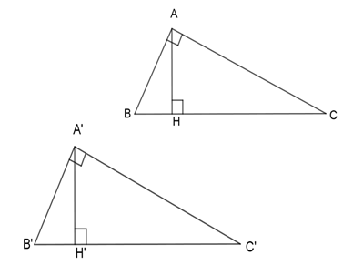 Xét bài toán: Cho tam giác ABC và \(A'B'C'\) có \(\widehat{BAC}=\widehat{B'A'C'}={{90}^{0}}\) và có các đường cao lần lượt là AH, \(A'H'\). Biết rằng \(\frac{AH}{AB}=\frac{A'H'}{A'B'}\). Chứng minh rằng \(\Delta ABC\backsim \Delta A'B'C'\).