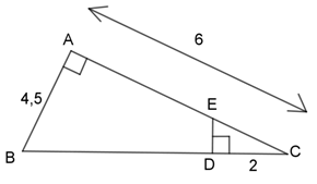 Cho tam giác ABC vuông ở A, AB = 4,5 cm, AC = 6 cm. Trên cạnh BC lấy điểm D sao cho CD = 2 cm. Đường vuông góc với BC ở D cắt AC ở E.