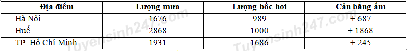 Cho bảng số liệu: LƯỢNG MƯA, LƯỢNG BỐC HƠI VÀ CÂN BẰNG ẨM CỦA MỘT SỐ ĐỊA ĐIỂM (Đơn