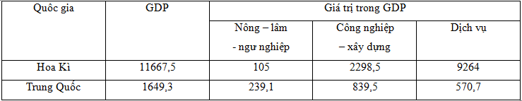 Cho bảng sau: Giá trị GDP của Hoa Kì và Trung Quốc năm 2010 (Đợn vị: tỉ USD) (Nguồn: Niên giám