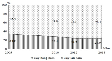 Căn cứ vào biểu đồ, hãy cho biết nhận xét nào sau đây đúng về cơ cấu diện tích cây công nghiệp nước ta giai đoạn 2005-2015