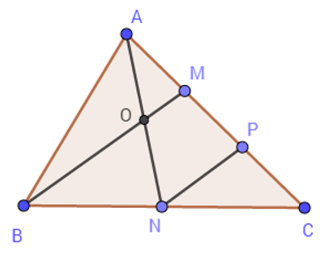 Cho tam giác ABC có diện tích \(12c{{m}^{2}}\) . Gọi N là trung điểm của BC, M trên AC sao cho \(AM=\frac{1}{3}AC\) , AN cắt BM tại O