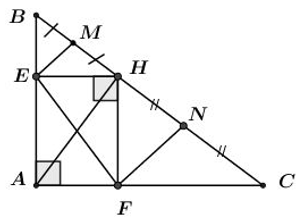 d) Gọi \(M,\,\,N\) lần lượt là trung điểm của \(HB\) và \(HC\). Tứ giác MNFE là hình gì? Tính diện tích tứ giác MNFE.