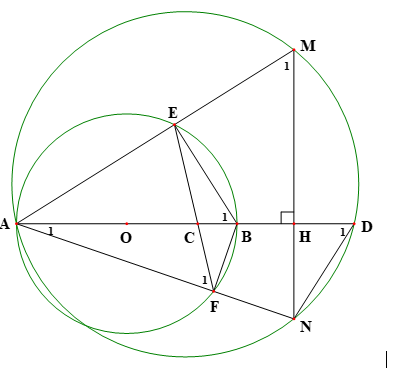 Cho đường tròn (O) có tâm là O, đường kính AB = 2R. Trên đường thẳng AB lấy điểm H sao cho B nằm giữa A và H (H không trùng với B), qua H dựng đường thẳng d vuông góc với AB. Lấy điểm C cố định thuộc đoạn thẳng OB (C không trùng với O và B). Qua điểm C kẻ đường thẳng a bất kỳ cắt đường tròn (O) tại hai điểm E, F (a không trùng với AB). Các tia AE và AF cắt đường thẳng d lần lượt tại M và N.