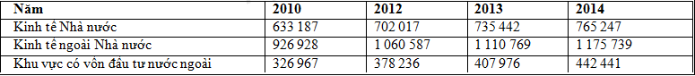 Căn cứ vào bảng số liệu, cho biết nhận xét nào sau đây không đúng về tổng sản phẩm trong nước phân theo thành phần kinh tế của nước ta, giai đoạn 2010 - 2014?