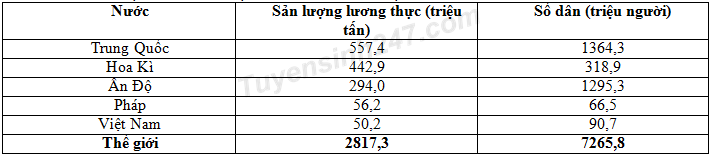 Cho bảng số liệu: SẢN LƯỢNG LƯƠNG THỰC VÀ SỐ DÂN CỦA MỘT SỐ NƯỚC TRÊN THẾ GIỚI NĂM