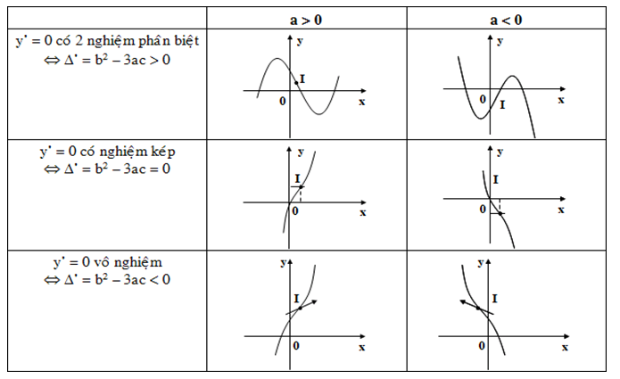 Chú ý dạng của đồ thị hàm số bậc 3 \(y=a{{x}^{3}}+b{{x}^{2}}+cx+d\left( a\ne 0 \right)\)