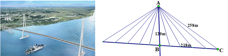 Cầu Vàm Cống bắc ngang qua sông Hậu nối liền hai tỉnh Cần Thơ và Đồng Tháp thiết kế theo kiểu dây giăng như hình vẽ. Chiều cao từ sàn cầu đến đỉnh trụ đỡ AB =120m, dây giăng
