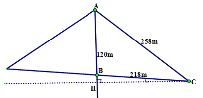 AC =258m, chiều dài sàn cầu từ B đến C là 218m. Hỏi góc nghiêng của sàn cầu BC so với mặt nằm ngang là bao nhiêu độ? (Giả thiết xem như trụ đỡ AB thẳng đứng).