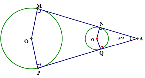 Hai ròng rọc có tâm O, O’ và bán kính R = 40cm, R’ = 10cm. Hai tiếp tuyến chung MN và PQ cắt nhau tại A theo góc 600. Tìm độ dài của dây cua- roa mắc qua hai ròng rọc?