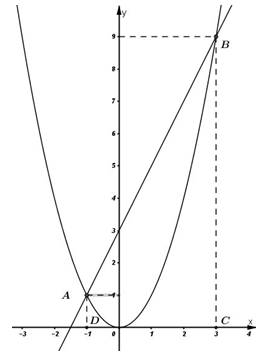 Cho \((P):y={{x}^{2}}\,\,;\,\,(d):y=2x+3\).Tìm tọa độ giao điểm A, B của (d) và (P). Gọi D và C lần lượt là hình chiếu của A và B lên trục hoành. Tính diện tích tứ giác ABCD (đơn vị diện tích).