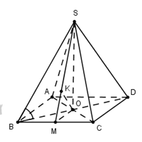 Cho hình chóp tứ giác đều \(S.ABCD\) có cạnh đáy bằng \(1\), cạnh bên hợp với mặt đáy một góc \({{60}^{0}}\). Tính khoảng cách Dtừ \(O\) đến mặt phẳng \(\left( SBC \right)\).