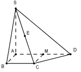 Cho hình chóp S.ABCDcó đáy ABCDlà hình thang vuông tại Avà B, \(AD=2BC,\) \(AB=BC=a\sqrt{3}\). Đường thẳng SAvuông góc với mặt phẳng \(\left( ABCD \right)\). Gọi \(E\) là trung điểm của cạnh \(SC\). Tính khoảng cách Dtừ điểm E đến mặt phẳng \(\left( SAD \right)\).