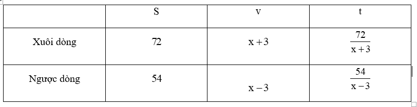 Một ca nô chạy xuôi dòng 1 khúc sông dài 72 km, sau đó chạy ngược dòng 54 km hết tất cả 6 giờ. Tính vận tốc thực của ca nô nếu vận tốc dòng nước là 3km/h.